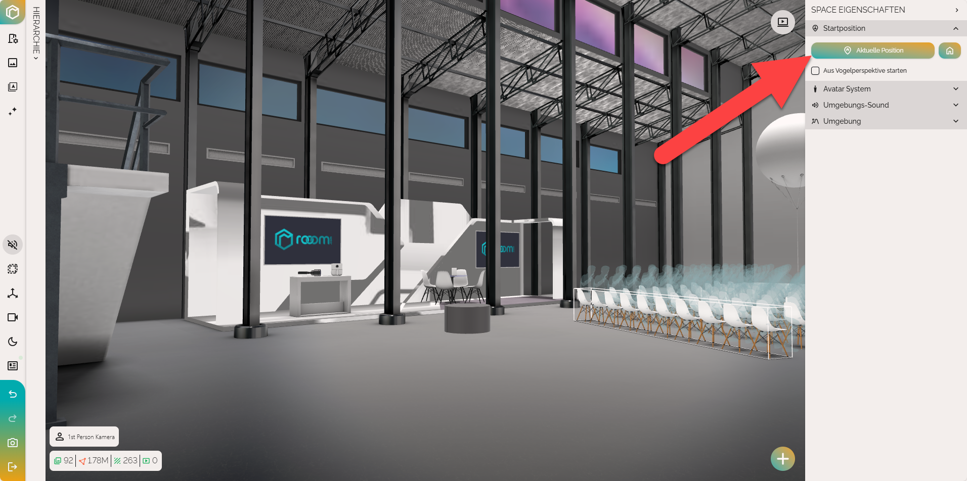 Das System übernimmt nun den genauen Punkt und die Blickrichtung, die du in Schritt 1 eingenommen hast, als Startposition. Du kannst den Startpunkt im Space Editor als roten Marker sehen.